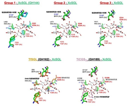 上段は各グループ、ファミリーの残基、下段はXcSGL(GH144)の残基を記載している。緑と白のスティック表示はそれぞれXcSGLの残基と基質の一部を示している。その他の色のスティック表示は各グループ、ファミリーの残基を示している。赤でラベルした残基はSGLクランを特徴付ける残基。触媒残基と触媒残基の候補は太字で示し、日本語でラベルしている。塩基触媒残基(GH189の場合は求核触媒残基)またはその候補の残基は、それらの位置の比較のためにアスタリスクを添えている。Group 1はE . elysicola由来SGLの構造である。右下E1442の下の - は対応する残基がないことを示している。