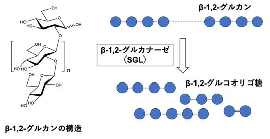β-1,2-グルカンは細菌によって生産される天然のグルコースポリマーであり、共生因子、浸透圧調節、宿主免疫系の回避など生理的に重要な役割を果たしています。細菌における役割だけでなく、β-1,2-グルカンの分解産物であるβ-1,2-グルコオリゴ糖が植物において免疫を誘導することも報告されています。β-1,2-グルカンの合成酵素としては、日和見感染菌Brucella abortus、根粒菌Sinorhizobium meliloti、植物病原菌Rhizobium radiobacter由来の環状β-1,2-グルカン合成酵素(CGS)が報告されています。分解酵素としては、2014年のグラム陽性細菌Listeria innocua由来1,2-β-オリゴグルカンホスホリラーゼの遺伝子同定が初めての報告になります。その後、この酵素を利用したβ-1,2-グルカンの大量合成法が確立されました。このβ-1,2-グルカンを用いて、β-1,2-グルカンからβ-1,2-グルコオリゴ糖を遊離するエンド型酵素(*3)であるβ-1,2-グルカナーゼ(SGL)が、細菌および糸状菌それぞれから遺伝子同定されています。これらの酵素はGHファミリーに属しており、細菌由来SGLはGH144、糸状菌由来SGLはGH162として新規なGHファミリーが創設されました(※1)。近年では、好熱性細菌Thermoanaerobacter italicus由来のCGSの機能未知ドメイン(TiCGSTg)が糖転移反応により直鎖状糖鎖を環状化できることが明らかになり、このドメインのグループに対しても新たなGHファミリー(GH189)が創設されました(※2)。