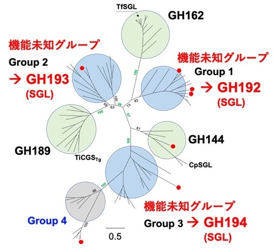 CpSGL (GH144)とTfSGL (GH162)をそれぞれクエリとしてPSI-BLASTを用いた相同性検索を行いました。その結果、GH144、GH162、GH189は互いに遠縁の関係にあっただけでなく、これまで報告されていなかった4つの機能未知のGroup 1~4が見出されました。また、これらがGH144、GH162、GH189とともに、巨大な系統群(SGLクラン)を形成していることがわかりました(図2)。