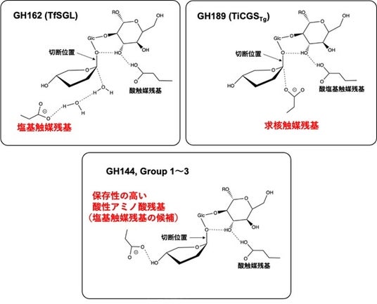 これらグループの酵素の立体構造と予測構造の解析、反応機構の解析、推定される触媒残基の位置の比較から、これら3つのグループが系統的に新規な糖質加水分解酵素(GH)のファミリー(*1)であることが示され、新規GHファミリーGH192、GH193、GH194が創設されました。