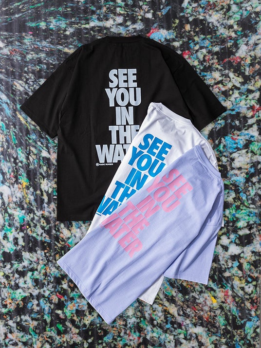 海岸等で回収したペットボトルをリサイクルして素材をつくり、商品化する取り組み“UpDRIFT(アップドリフト)”と、ビーチ、サーフカルチャーとの親和性が高いMAGIC NUMBERを迎えたコラボレーションTシャツ。MAGIC NUMBERのアイコンである“SEE YOU IN THE WATER”というワードをプリントしました。
