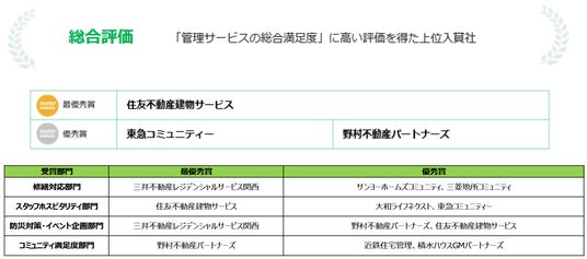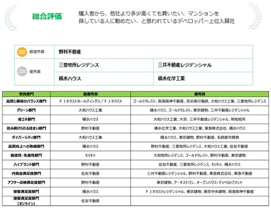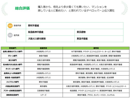 首都圏・関西ともに、総合評価で「野村不動産」が最優秀賞を受賞!部門別での初受賞は、首都圏は「積水化学工業」「アーネストワン」、 関西は「住友商事」「大和地所レジデンス」「ホームズ」「ヤマイチ・ユニハイムエステート」