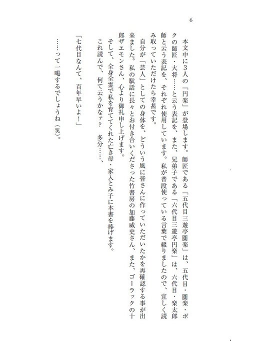 本書は、父親が高名な落語家(三遊亭好楽)で、父親の師匠(五代目三遊亭圓楽)に入門し、実の親子なのに兄弟弟子という不思議な関係の著者が、その溢れる落語愛と、二世落語家の立場に甘えず精進したことから、七代目円楽襲名の花を咲かせることになった経緯を綴った半生記で、先代、先々代の円楽という噺家の存在が、三世代に亘って世間に愛され記憶される理由を、著者の体験を通じて綴られている。