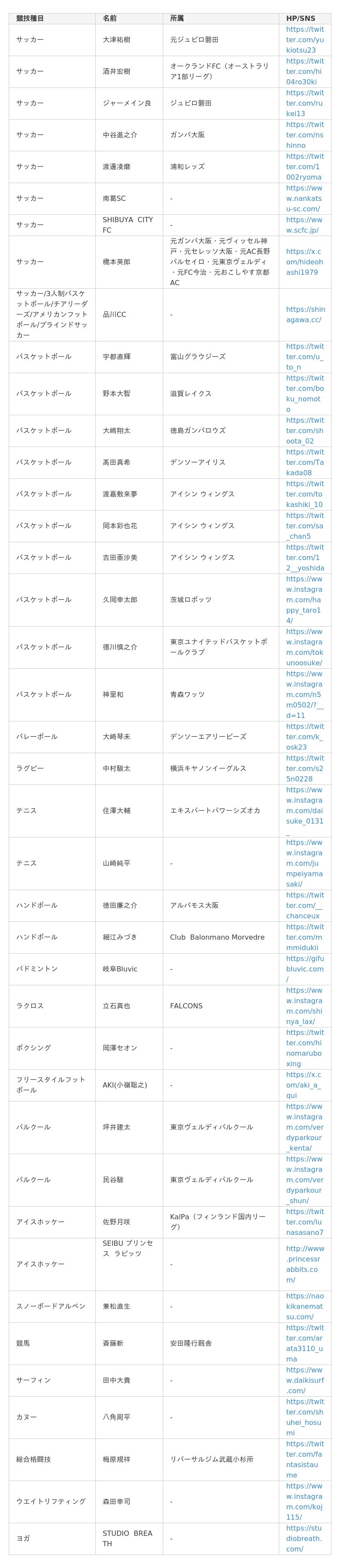 <BASE UP SPORTS サプライヤー契約一覧(現時点)>