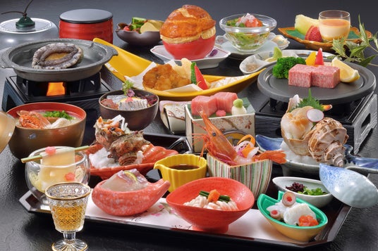 ロンドンで開催された2025年度の世界最高峰のワインコンクール「インターナショナル・ワイン・チャレンジ(IWC)」で金賞を獲得した「鶴岡甲州2023」ワインが、お二人様につきフルボトル1本付いてくる特別なプランです。鶴岡市「ピノ・コッリーナ松ケ岡」で製造されたこの白ワインは、樹齢約60年の希少な甲州ブドウの古木から収穫され、青りんごや柑橘、スモーキーな香りが特徴で、日本海の新鮮な魚介料理との相性は抜群です。 ご夕食は、旬の海の幸を美しく盛り付けた「お刺身九重」と、とろけるような「特選山形牛ステーキ」をメインとした贅沢な会席料理を、プライベートな空間でお楽しみいただけます。