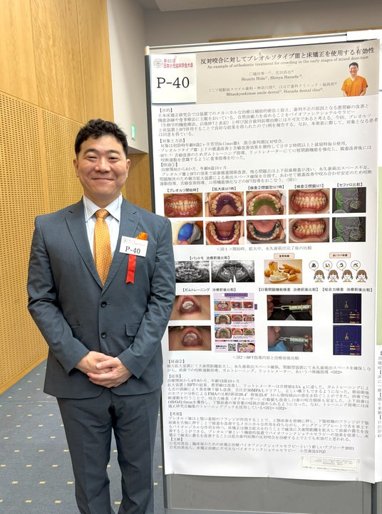 当院院長 樋田秀一も「反対咬合に対してプレオルソタイプIIIと床矯正を使用する有効性」に関するポスター発表を行いました。全国から参加した小児歯科医・矯正歯科医・大学研究者らと活発な意見交換が行われ、症例に対するアプローチの違いや地域特性をふまえた指導法など、今後の臨床現場での応用につながる多くの学びを得ました。