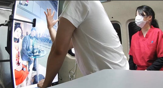 セッションの後半では、東京ビッグサイトの会場にいる安藤氏と仙台市の診療カーをつなぎ、ご自身が医師である自見地方創生担当大臣にもご参加いただき、安藤氏による「窓」を活用したオンライン診療のデモンストレーションが行われました。あたかも同じ空間で診療が行われているかのような、遅延感のない自然なコミュニケーションにほぼ満席の会場からは驚きの声が上がり、自見大臣からは「小児科医にとって肌の状態を知ることは診察をするうえで大事で、『窓』を活用することによって「結膜の感じまでクリアに見え鮮明であり、そこにいるのではないかという感覚がある」といった発言がありました。