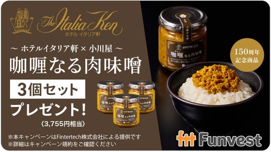 【A賞】300万円以上の出資でもれなく【B賞】抽選で10名様に「ホテルイタリア軒×小川屋 咖喱なる肉味噌3個セット(3,755円相当)」をプレゼント!