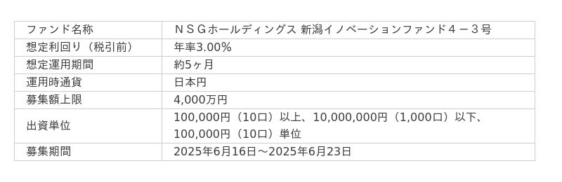 「未来をわかちあう投資」を提供する「Funvest(ファンベスト)」(以下、Funvest)は、「NSGホールディングス 新潟イノベーションファンド4-3号」(以下、本ファンド)の募集を6/16より開始しますので、お知らせいたします。
