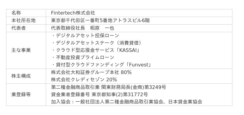 Fintertechは、大和証券グループ及びクレディセゾンがそれぞれ創業来培ってきた金融ビジネスのノウハウを礎としながら、最先端のテクノロジーの活用や外部企業との連携により次世代金融サービスを機動的にかつ柔軟に創出することを目指しています。 主な事業として、暗号資産を活用した「デジタルアセット担保ローン」及び「デジタルアセットステーク(消費貸借)」、クラウド型応援金サービスの「KASSAI」、「未来をわかちあう投資」を提供する貸付型クラウド名称ファンディングサービス「Funvest(ファンベスト)」を展開しています。