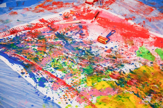 さまざまな色彩が混ざり合った大判布の断片――子ども達と障がいのある方々の手から生まれた自由なタッチとローラーの跡。