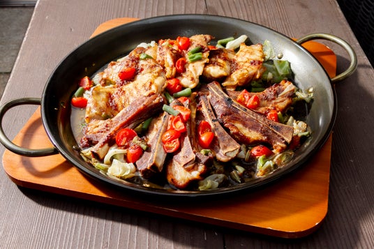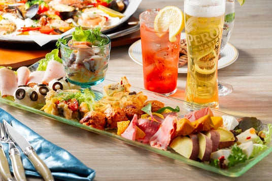 メインディッシュのお勧めは、具沢山でおこげが最後のお楽しみ「シーフードパエリア」、遠慮なく手でガシッと噛みしめたいジューシーな「骨付きスペアリブとローストチキン」は食べ応えが抜群、熟練のシェフがジャストの火入れ「国産牛タリアータ」はレストランシェフならではのハイクオリティの一皿。その他「ガーリックトースト」や「グリルソーセージ」等の名脇役で抜かりなく。