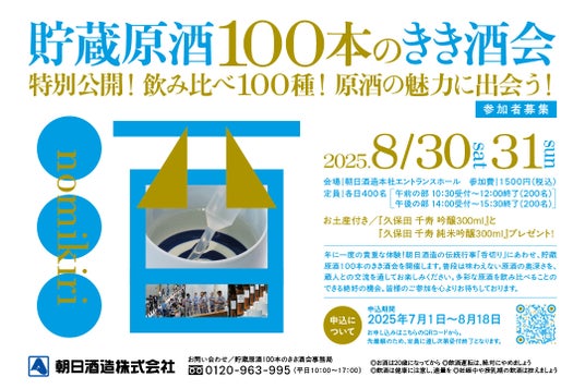 朝日酒造株式会社(本社:新潟県長岡市、代表取締役社長:細田康)は、年に一度、日本酒を貯蔵している全タンクから少量の酒を取り出し、酒質や熟成の進み具合をきき酒により評価する「初呑切り(はつのみきり)」を毎年夏に行っております。酒蔵ならではの伝統行事を一般のお客様にご体感いただくイベントとして「貯蔵原酒100本のきき酒会」を朝日酒造エントランスホールで8月30日(土)から8月31日(日)の2日間限定で開催いたします。「初呑切り」で取り出した原酒を100種取り揃えております。普段は味わえない原酒の奥深さをお楽しみください。