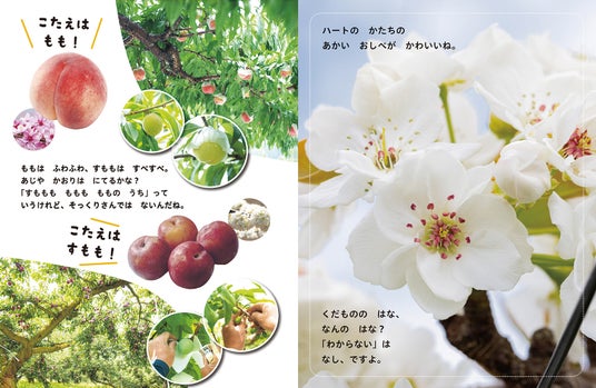 お花の形から、なんのくだもの花なのか? を推測するのがむずかしいですが、たのしいテキストがヒントになっているので、クイズ形式で、楽しみながら、学ぶことができます。
