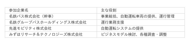 名鉄バス株式会社(本社:名古屋市中村区、代表取締役社長:瀧 修一)、名鉄グループバスホールディングス株式会社(本社:名古屋市中村区、代表取締役社長:瀧 修一)、先進モビリティ株式会社(本社:茨城県つくば市、代表取締役社長:瀬川 雅也)、みずほリサーチ&テクノロジーズ株式会社(本社:東京都千代田区、代表取締役社長:吉原 昌利)の4社は、このたび、愛知県が実施する「高速バスの自動運転実証」に参画します。
