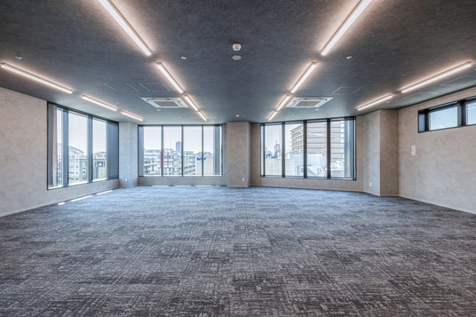 本物件は、2024年6月竣工で靖国通り沿いに立地し、ガラス張りのファサードが目を惹く11階建てオフィスビルです。約27坪の室内は、空調やダクトを隠さないスケルトン天井や (一部フロア除く)、角地の立地特性を活かした二面採光を採用しており、開放感を感じられます。基準階フロアではハーフセットアップを実施しており、会議室や受付カウンターが付帯しています。