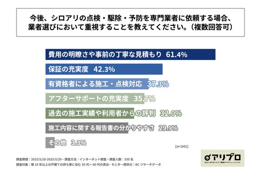 調査の最後、住居のシロアリ対策を行っていない人を対象に「今後、シロアリの点検・駆除・予防を専門業者に依頼する場合、業者選びにおいて重視すること」を尋ねる設問への回答では、1位が「費用の明瞭さや事前の丁寧な見積もり」で61.4%、2位が「保証の充実度」で42.3%、3位が「有資格者による施工・点検対応」で37.3%という結果になりました。この結果から、住居のシロアリ対策を行っていない人が、今後シロアリの点検・駆除・予防を専門業者に依頼する場合、業者選びにおいて主に重視することは「費用の明瞭さや事前の丁寧な見積もり」や「保証の充実度」であることが明らかになりました。