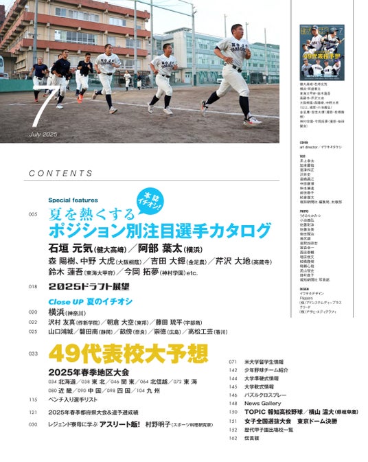 巻頭では、「本誌イチオシ!ポジション別注目選手カタログを掲載」。最速158キロを誇る健大高崎(群馬)・石垣元気投手、センバツ優勝の横浜(神奈川)・阿部葉太主将を始め期待の逸材たちを迫力満点の写真とともに一挙紹介。チームルポでは松坂世代以来の春夏連覇を狙う横浜の現在地に迫るほか、山口鴻城、磐田南(静岡)、畝傍(奈良)、崇徳(広島)、高松工芸(香川)などの話題校を特集。特に山口鴻城のユニホームは甲子園を熱狂させたあのチームにソックリ!ぜひお手に取ってお確かめください。