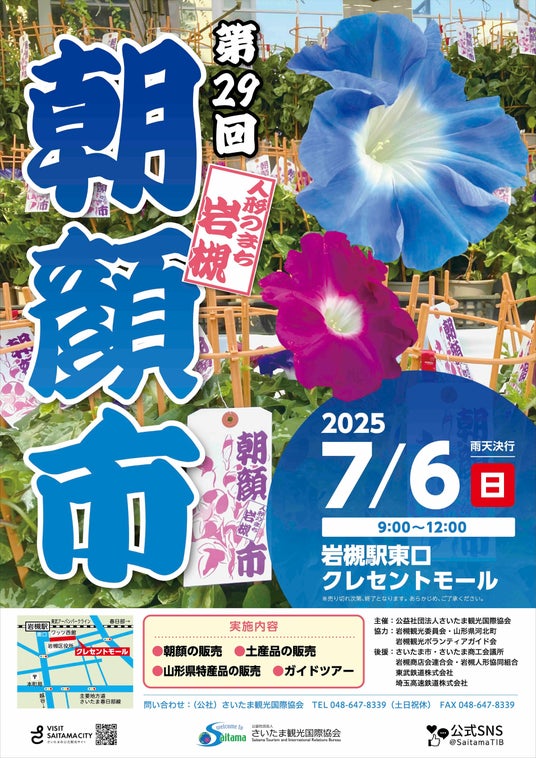 天狗羊羹、さいたま名物煎餅類、願かけヌゥだるま等(3) 山形県河北町の特産品などの販売 ※さくらんぼの販売はありません。(4) 岩槻観光ツアー(参加無料) ・集合場所 朝顔市会場内の観光ボランティアガイド会テント ・時間 9:30~/10:00~ ※各時間ともコースは同じです。 ・コース 芳林寺→市宿・久保宿→遷喬館→人形博物館(※)→(以降希望者のみ)→大龍寺→愛宕神社 ※自由見学(入館いただけます)、一時解散 ・申し込み方法 a. インターネット https://forms.gle/3KTsK3zUSLRbCGFQA b. 電話 048-647-8339(平日9時から17時45分まで) c. FAX 048-647-0126 ※b、cの場合は、氏名・電話番号・住所・参加人数・参加希望回をお知らせください。(5) キッチンカーの出店:2店舗