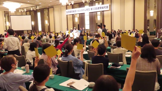 生活協同組合パルシステム埼玉(本部:埼玉県蕨市、理事長:西内良子)は6月17日(火)、パレスホテル大宮(さいたま市大宮区)で第32回通常総代会を開催し、提案された4議案すべてが可決、承認されました。総代会後に開催された理事会で代表理事の選定などが審議され、代表理事理事長の西内良子をはじめ新たな役員体制が決まりました。
