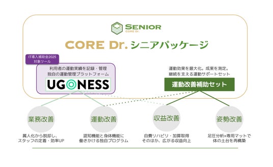 「シニアパッケージ」におけるIT導入補助金の対象範囲は、パッケージ全体ではなく、運動管理プラットフォーム「UGONESS(ウゴネス)」単体のみとなりますのでご注意ください。