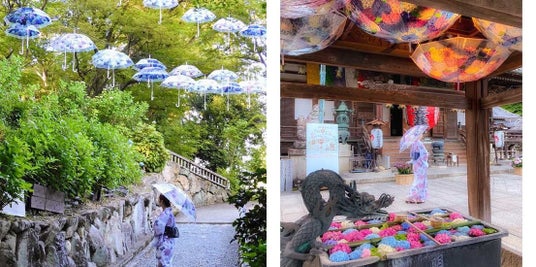 眼病平癒の祈願所として、平安時代より特別な方々をはじめとする眼病に悩む多くの人々に信仰されてきた京都府長岡京市の柳谷観音。境内に京都最大規模の約5,000株のあじさいが咲き誇ります。6月1日~6月30日の期間「柳谷観音あじさいウィーク」が開催され、限定御朱印の授与や上書院特別公開、ワークショップなどのイベントも開催されています。境内では新緑に映えるアンブレラスカイのほか、SNSで話題の「花手水」と傘のコラボレーション展示もご覧いただけます。