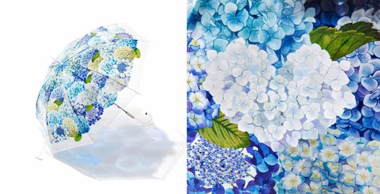 雨の日を美しいグラデーションで彩る紫陽花を、空いっぱいに広げて思う存分堪能できる傘ができました。繊細&ていねいに描いた紫陽花のリアルなイラストを透明傘にのせているので、外から見れば紫陽花の花束のよう。内側から見上げれば、まるで紫陽花が空から咲きこぼれてくるような気分を味わえます。