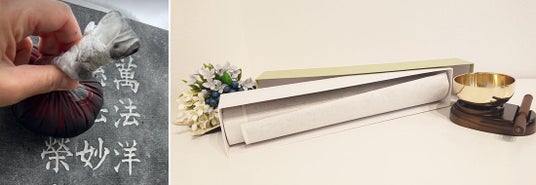 墓石に彫刻された、ご先祖のご戒名等の文字を残すことができるオプションサービス。湿式拓本専用の油と墨を使用し、石の素材に合わせた画仙紙に文字を採拓するものです。