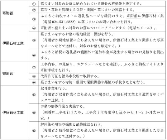 福島市ふるさと納税で伊藤石材工業が提供する「墓じまいサービス」では、下記の流れと条件で、遠方にいても福島市内の墓じまいが可能です。