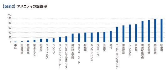 アメニティごとの設置状況を見ると、BCPやセキュリティ対策に関連する防災・防犯設備の設置率は90%以上に達しています【図表2】。経営層や一部の業種が必要とする駐車場・車寄せも、それぞれ96%、75%と高い設置率を示しています。企業にとって必要不可欠と考えられる「企業向けのアメニティ」ほど、導入が進んでいる傾向にあります。また、従業員の昼食ニーズに対応するコンビニエンスストアやレストランも、60%以上のオフィスビルに整備されています。