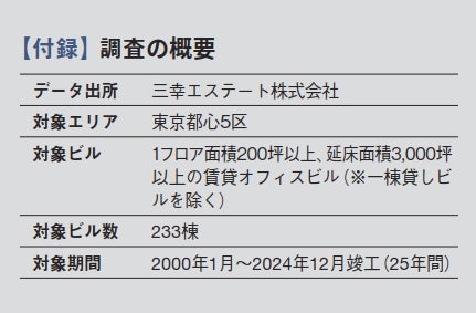 三幸エステート株式会社※1は賃貸オフィスビルに関する各種データを活用し、筑波大学 不動産・空間計量研究室※2と共同でオフィス市場の動向に関する調査を行っています。今回は2000年以降に竣工した大規模ビルにおける各種アメニティの設置傾向に関する調査結果を公表します※3。