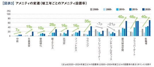 設置率が40%以下のアメニティについて竣工年ごとの設置傾向を見ると、ラウンジ等、2020年以降竣工したビルに多いアメニティもあれば、フレキシブルオフィスやリフレッシュコーナーなど、2000~2004年の竣工ビルに多く設置されるアメニティがあることも分かります【図表3】。