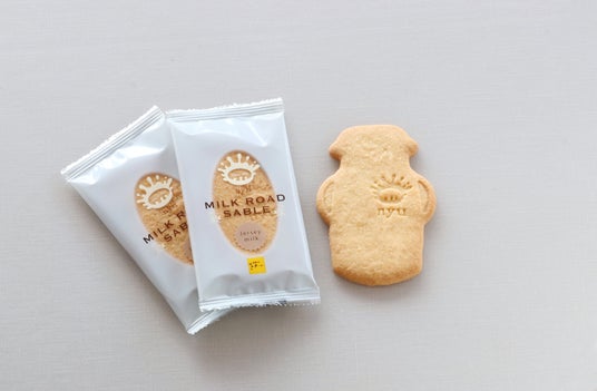 商品4:nyuミルクロードサブレ 販売価格:1個 216円(税込)ジャージーミルクを使用した生地を、軽やかなサブレに焼き上げました。かつて瓶に詰めた牛乳を、町のあちこちに届けていた道のりと記憶をたどりながら、このサブレを「ミルクロード」と名づけています。袋を開けたときのたのしさも大切に、牛乳瓶のかたちに焼き上げ、ミルククラウンの焼き印を添えました。