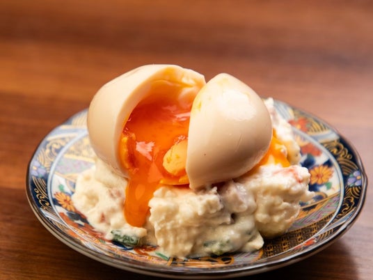 煮卵ポテトサラダジャガイモたっぷりポテトサラダに、味の染みた半熟煮卵を贅沢にトッピング。まろやかな黄身とポテトの相性は抜群で、酒の肴にもぴったりな、ちょっと贅沢な定番サラダです。