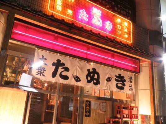 浦安たぬき浦安駅前にある、ネオンサインと大きなのれんが目印の「荻窪たぬき」の姉妹店「浦安たぬき」。