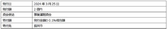 私募債発行額の0.1%相当額の物品、寄付金などを長岡市へ寄贈予定