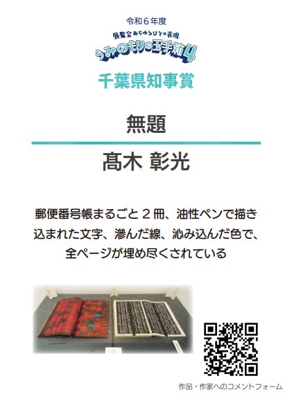 今回展示する作品は、千葉県障害者芸術文化活動支援センターうみのもり令和6年度展覧会「あらゆるひとの表現 うみのもりの玉手箱4」の受賞作品です。