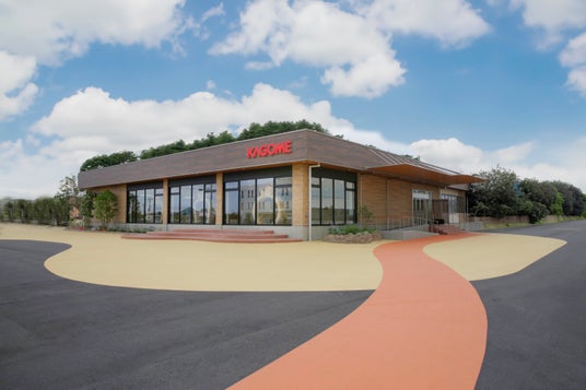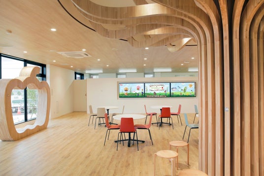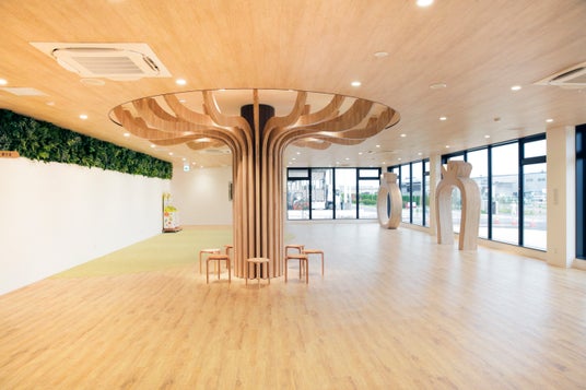 那須工場の敷地内へ一歩入ると、ガラス越しに野菜のオブジェが見える楽しそうな建物がお出迎えします。内装は木材を多く使用した落ち着いた空間で、中央にはシンボルのトマトツリーがあり、野菜の会社らしい空間デザインとなっています。