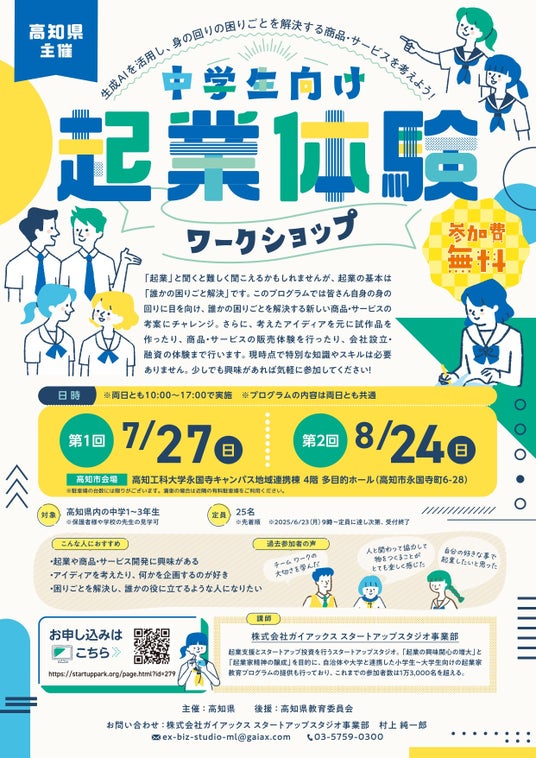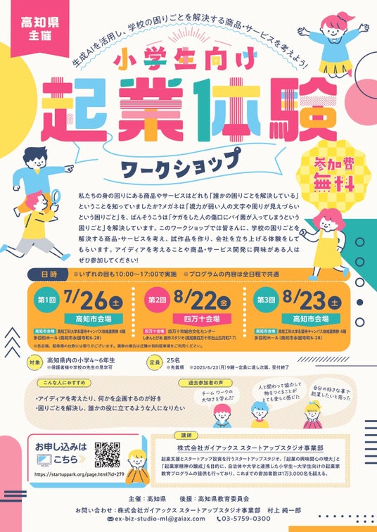 小中学生向けの起業家教育プログラム「起業ゼミ」を運営する株式会社ガイアックス(本社:東京都千代田区、代表執行役社長:上田 祐司、証券コード:3775、以下「ガイアックス」)は、高知県より「令和7年度起業体験推進事業」の企画・運営を受託しました。
