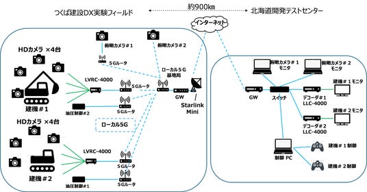 ハイテクインター株式会社(本社:東京都渋谷区、代表取締役社長 旦尾 紀人、以下ハイテクインター)、株式会社ジツタ中国(本社:広島県広島市、代表取締役社長 實田泰之、以下 ジツタ中国)、国立研究開発法人土木研究所(所在地:茨城県つくば市、理事長 藤田光一、以下 土木研究所)は、2025年6月12日に建設DX実験フィールド(茨城県つくば市)と約900km離れたハイテクインター北海道開発テストセンター(北海道沼田町)間において、10台のハイビジョンカメラ映像と超低遅延エンコーダを用いて2台の建設機械(以下 建機)の遠隔操縦に成功しました。多数の高品質なカメラ映像を1台の「Starlink Mini」を用いて伝送し、遠隔地から2台の建機を操作することは世界的にも先駆的な取り組みになります。