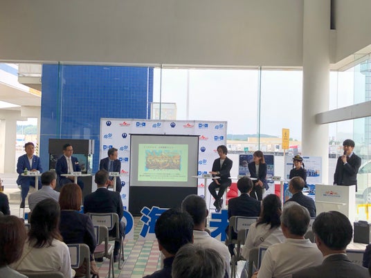 トークセッションを行うパネリストたち (左から大洗町長 國井豊、当社常務執行役員 向井恒道、商船三井さんふらわあ会長 尾本直俊、イノカ代表 高倉葉太、e-Combu代表 大砂百恵、MOL小中学生アンバサダー (註2)瀬之上綾音)