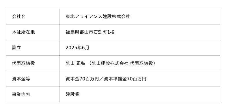 隂山建設株式会社(本社:福島県郡山市、代表取締役:隂山 正弘)は、東北6県を代表する地場建設会社6社※1および株式会社みずほ銀行(頭取:加藤 勝彦、以下「みずほ銀行」)と共に、「東北アライアンス建設株式会社」(代表取締役:隂山 正弘、以下「東北アライアンス建設」)を6月30日に設立予定です。