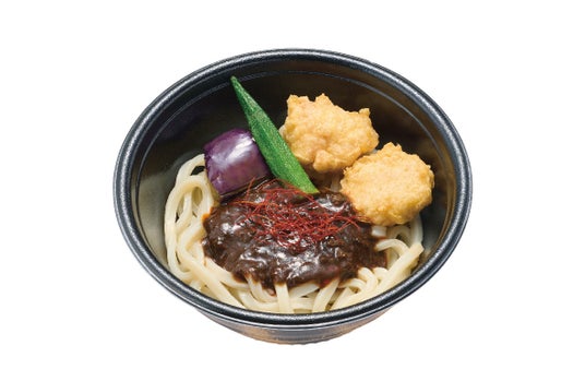 暑い季節にぴったりの本格ピリ辛・混ぜうどん風の新商品。とり天、なすやオクラを添えて、黒胡麻・甜麺醤(テンメンジャン)・豆鼓醤(トウバンジャン)をベースにした特製担々ソースをたっぷりとかけました。豆板醤を油で炒めてから配合することで、より風味豊かに仕上げています。