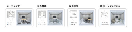 通常の対面ソファを用いたミーティングスペースとしての利用の他、設置する家具やレイアウトを変更することで、立ち会議や役員室等の個室空間としても利用できます。さらに、雑談スペースやリフレッシュルームなど用途に応じた多様な活用が可能です。