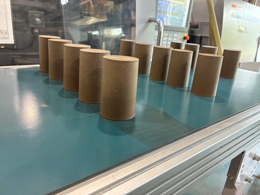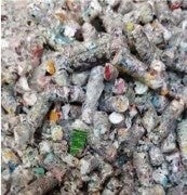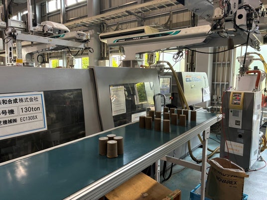 剪定枝はチップ化した後、パウダー状に加工します。プラスチック資源は粉砕してペレット状に加工します。加工した剪定枝のパウダーとプラスチック資源のペレットを混合し、射出成形することで、筒部分とキャップ部分を製造します。
