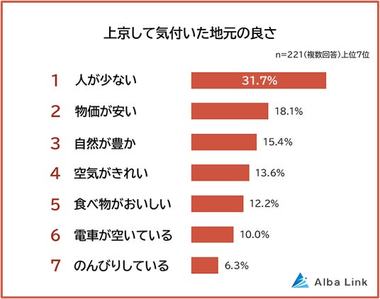 株式会社AlbaLink(本社:東京都江東区、代表取締役:河田 憲二)は、東京で仕事または居住している地方出身者221人を対象に「上京して気付いた地元の良さに関する意識調査」を実施し、そのデータをランキングにしました。