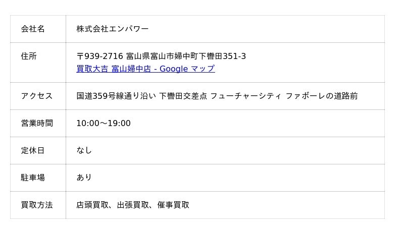当店はアピタ富山東店の2階にあり、出張買取にも対応。店内は明るく広々とし、ショッピングついでに立ち寄りやすいのも魅力です。査定テーブルは2つあり、ドリンクサービス付きで、待合スペースも完備しています。台車サービスも行っているので、車での来店もおすすめです。