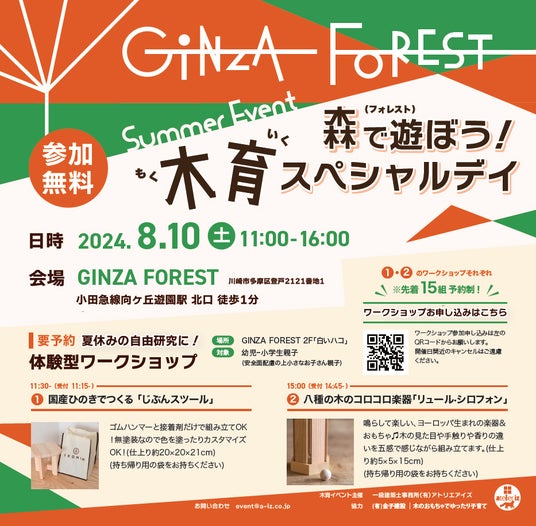 20周年を記念して、地域の皆様と一緒に楽しめるイベント「木育スペシャルデイ」を開催いたします。会場は、小田急線 向ヶ丘遊園駅北口前「ギンザフォレスト」(弊社設計・複合施設建築)。