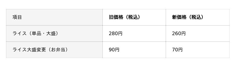 お客さまに長年ご支持いただいてきた“ライス大盛”こそ、まずは最初に価格でお応えしたい、というのが今回の価格改定に込めた我々の想いです。