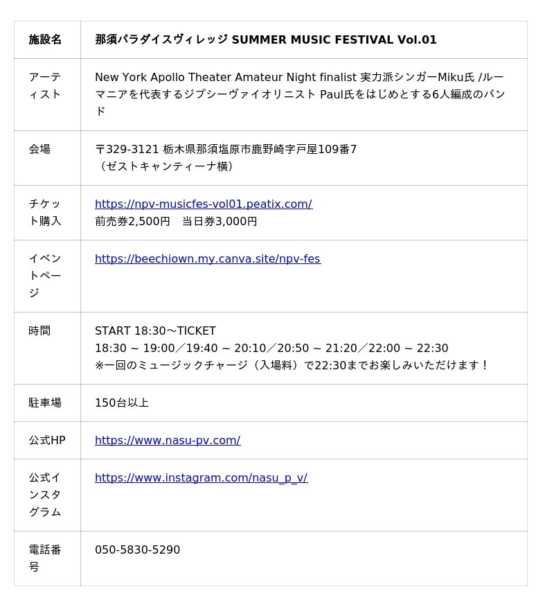 那須パラダイスヴィレッジ SUMMER MUSIC FESTIVAL Vol.01